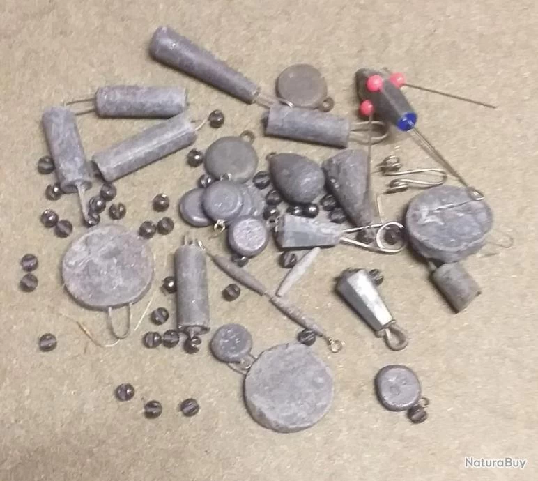 Plombs de divers formes et poids dont un grappin a quatres branches rétractables