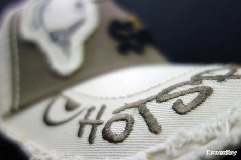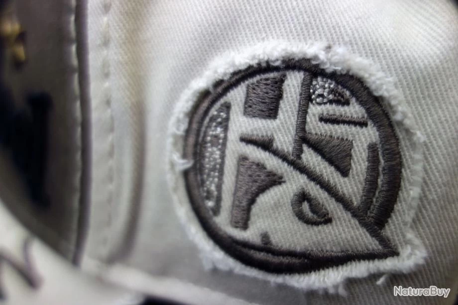 Visière: texte “Hotspot Design” brodé tout autour de la visière qui présente un bord effiloché bien visible.