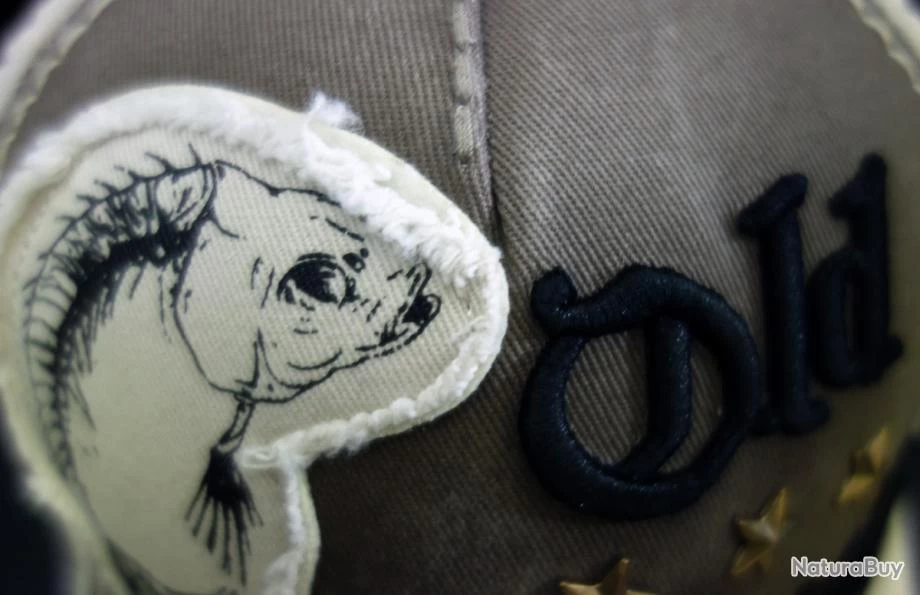 Capuchon devant: patch avec bordures en détresse comprenant un squelette de poisson (imprimé), texte “Old School” brodé en 3D avec trois étoiles métalliques appliquées au milieu.