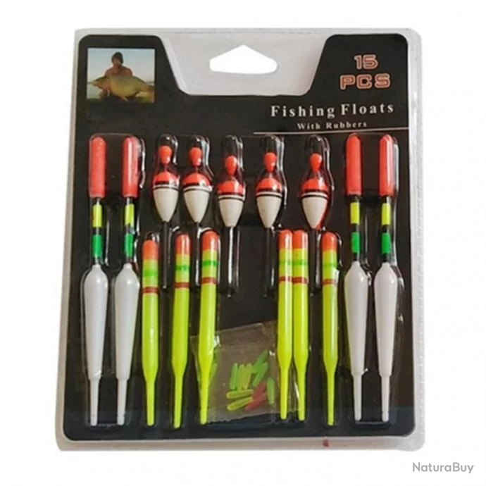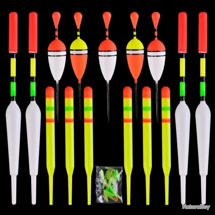 5 tiges de bobbes (8cm) + 6 tubes de flotteurs jaunes (9.5cm) + 4 longs flotteurs (15cm)