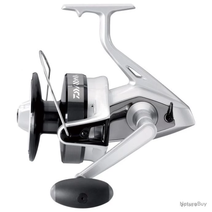 Moulinet Spinning DF 100 B de chez Daiwa, d’un poids de 870g et doté d’un frein de 15kg.
