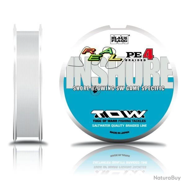 TresseTOW REAL PE4 Inshore de chez Black Flagg, conditionnée en bobine de 200m et disponible en 4 diamètres différents.